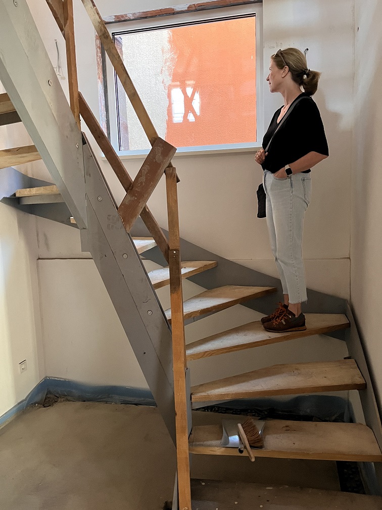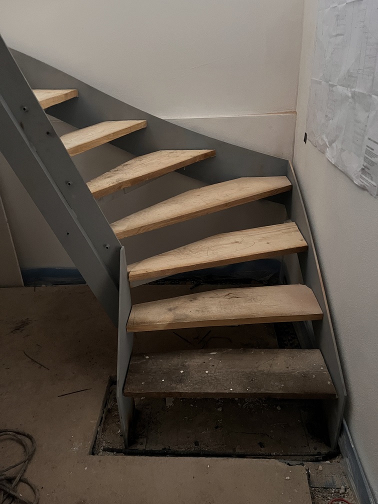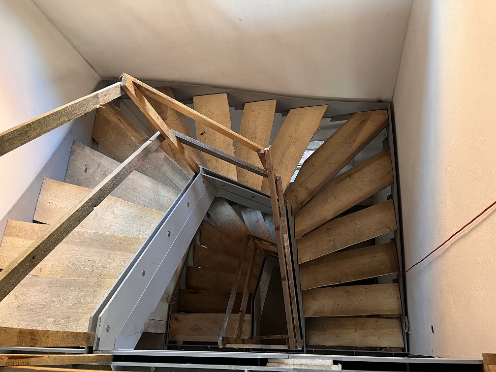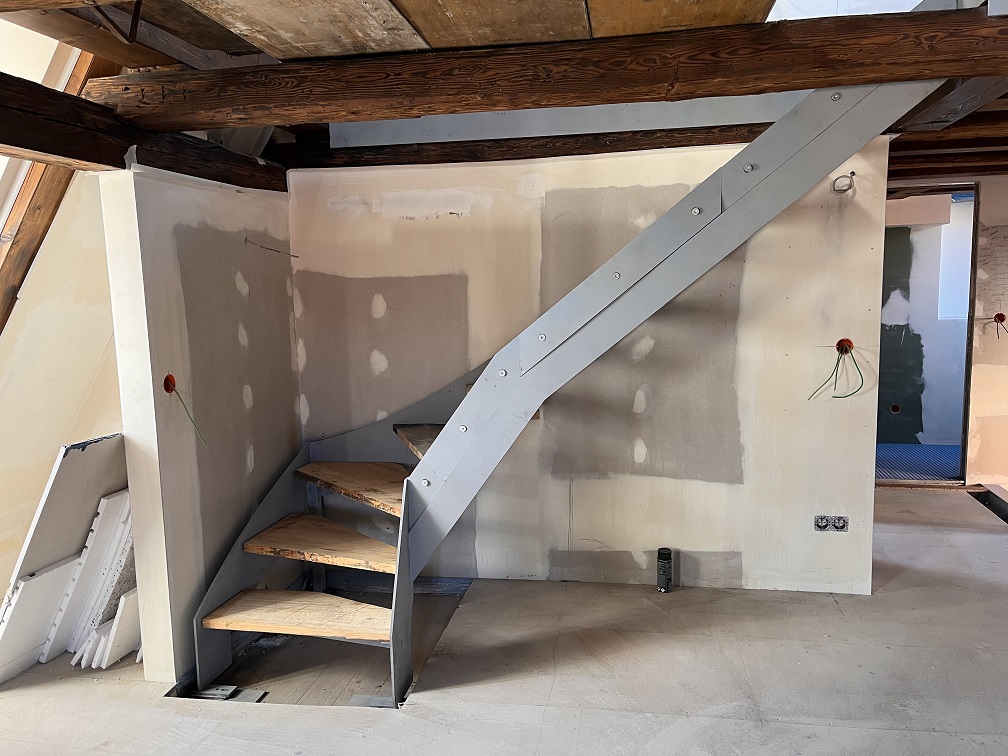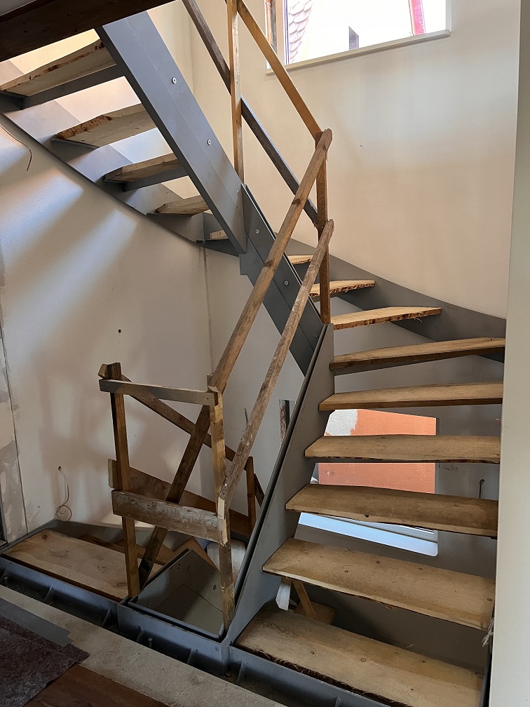 Nach einigen Tagen ohne Zugang zum Dachgeschoss, sind die drei Stahltreppen jetzt eingebaut. Passt soweit erstmal alles gut zusammen. Noch sind Baustufen eingesetzt, die erst nach dem Umzug aller Möbel ausgetauscht werden sollen. Und dann kommt auch das Geländer.