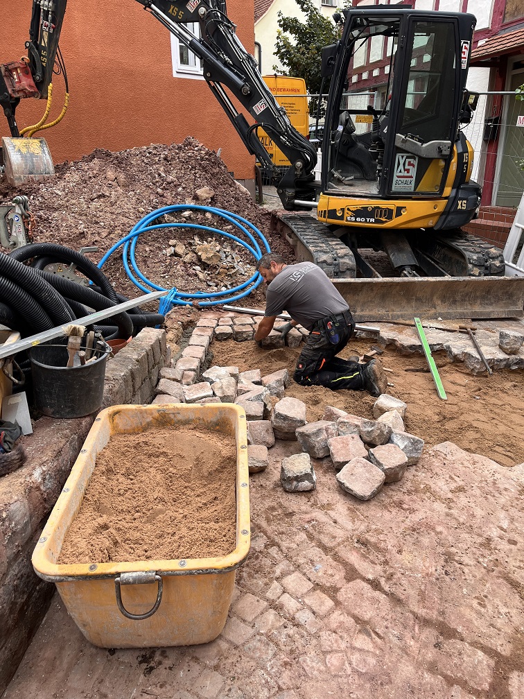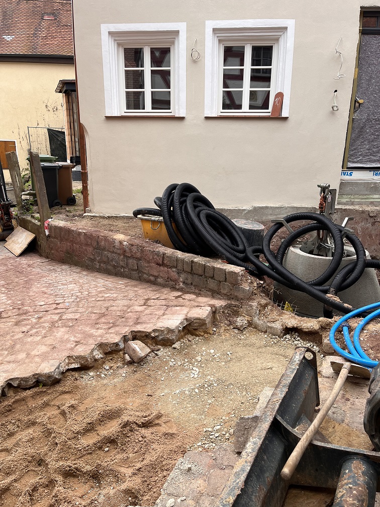 Es tut sich was in Sachen Versorgung. Ein großes Loch ist vor dem Haus entstanden und ein wuchtiger Kanalschacht gesetzt. Das Abwasserrohr aus dem Haus ist schon angeschlossen und der Abfluss in Richtung öffentlichem Kanal gemacht. Dort ist das auch schon verbunden und wieder mit Sand verfüllt. Müssen nur noch die Kopfsteinpflastersteine wieder verlegt werden. So kann es weitergehen.