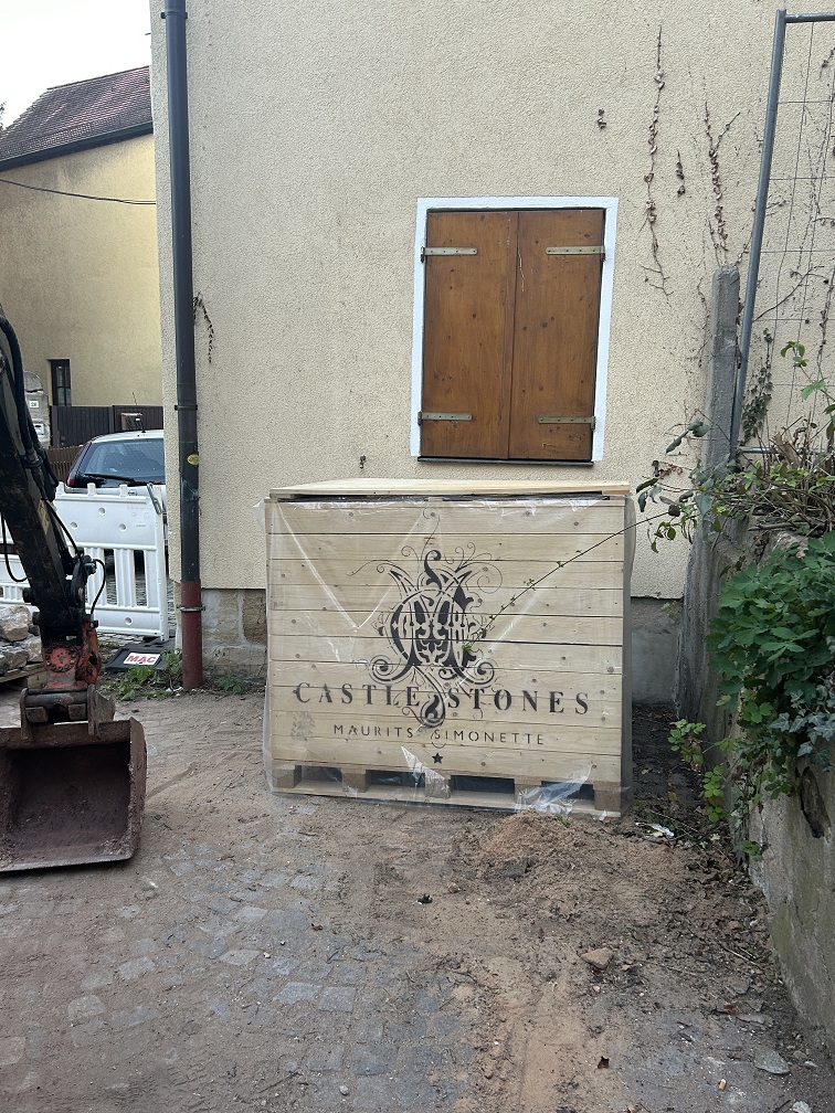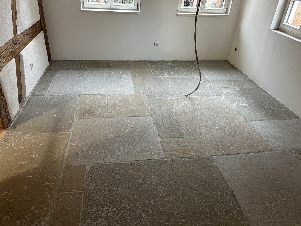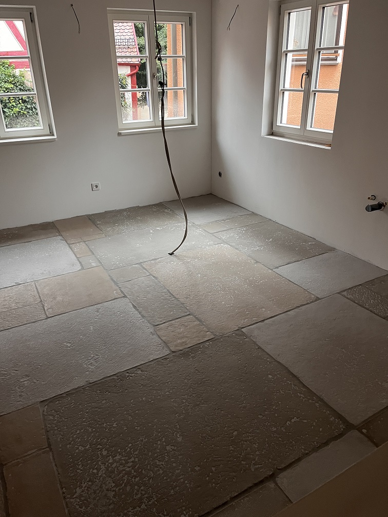Ein weiterer Mittwoch Morgen und wieder hat sich einiges getan. A.K. hat sich ins Zeug gelegt und die ersten Castle Stones aus den Schatzkisten im Haus verlegt. Ist gar nicht einfach die unsortierten Größen in ein annehmbares Muster zu bringen und dann auch noch ordentlich zu verlegen. Hohe Fliesenleger Kunst!!!