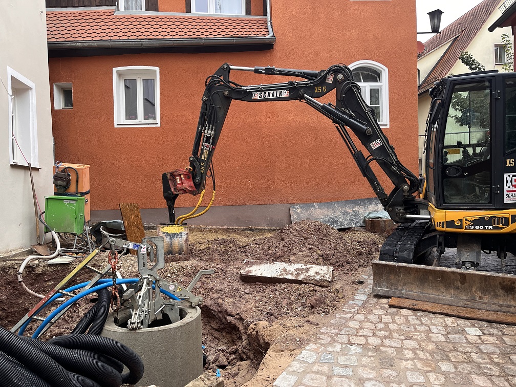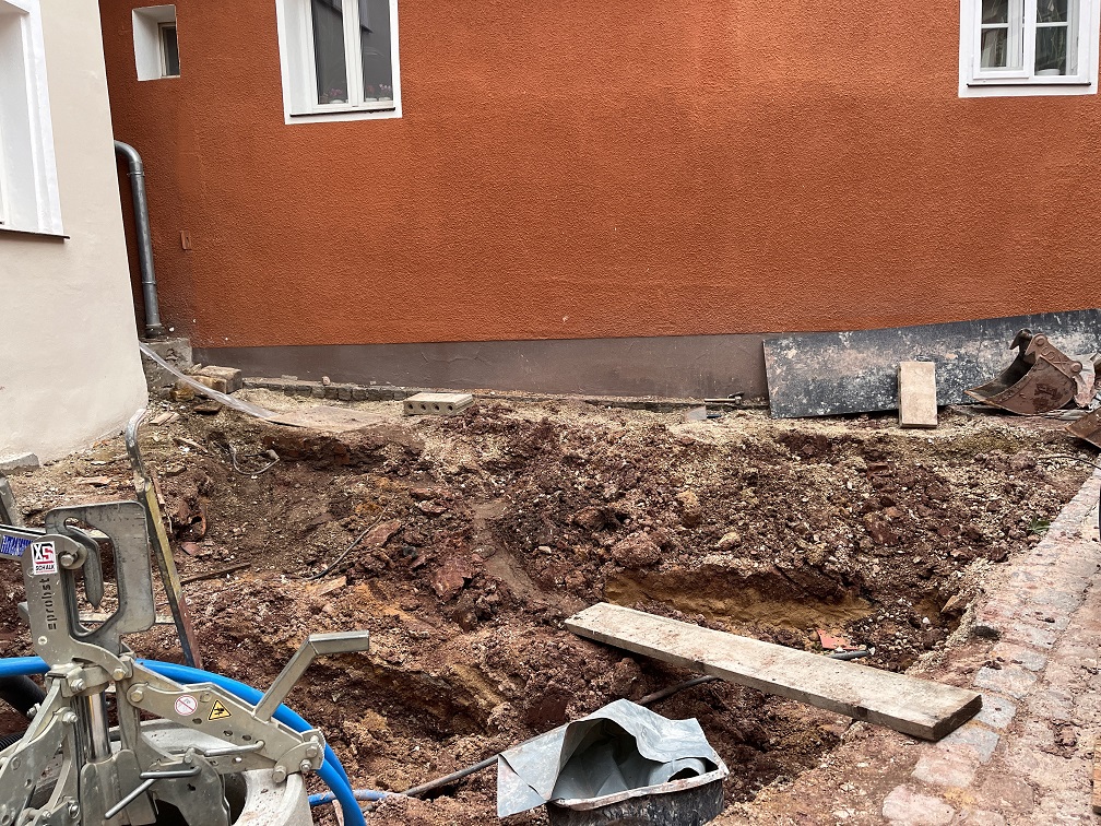 Vor dem Haus ist inzwischen auch schon ein tiefes Loch entstanden und der Schacht für die Entwässerung gesetzt. Leider etwas zu hoch, aber das lässt sich wohl noch ändern….. Ganz nah ans Nachbarhaus müssen wir ran mit der Grabung – ob das alles auch hält?