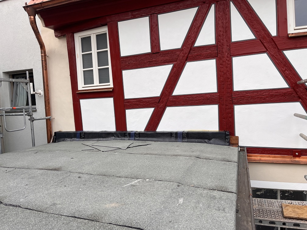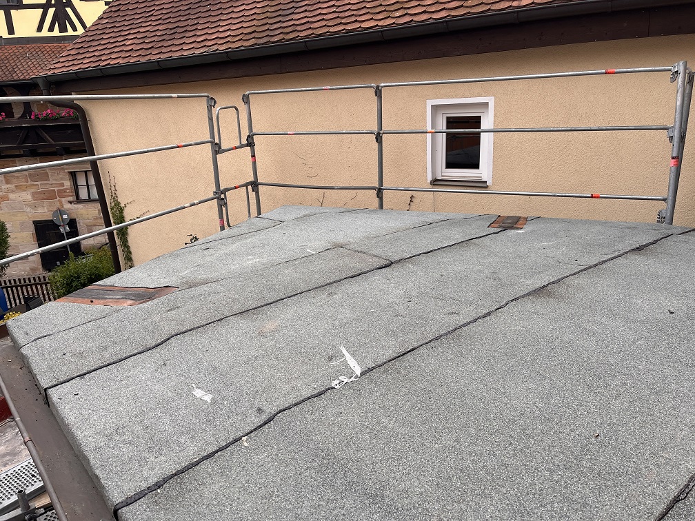 Und ganz nebenbei ist dann auch noch der Anbau mit einem Dach versehen worden. Die Angelegenheit war auch ganz schon zäh, im wahrsten Sinne des Wortes. Immerhin hat das auch noch geklappt, bevor am Freitag (!) das Gerüst final abgebaut werden soll. Wir warten mal ab, ob der Zusage auch Taten folgen.