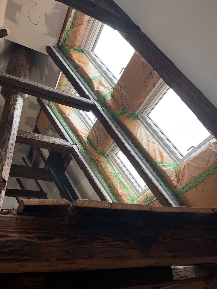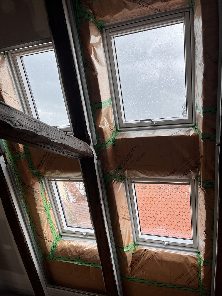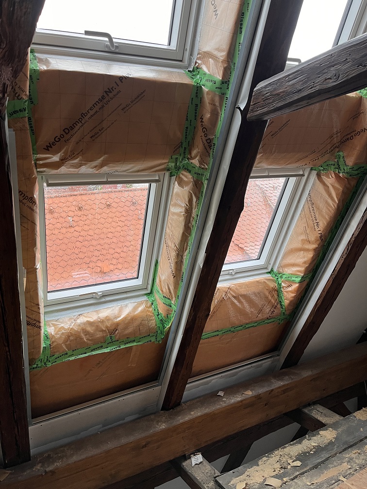Und tatsächlich die weißen Fenster sind eingebaut und die Dämmung verklebt. Hoffentlich ist alles dicht.