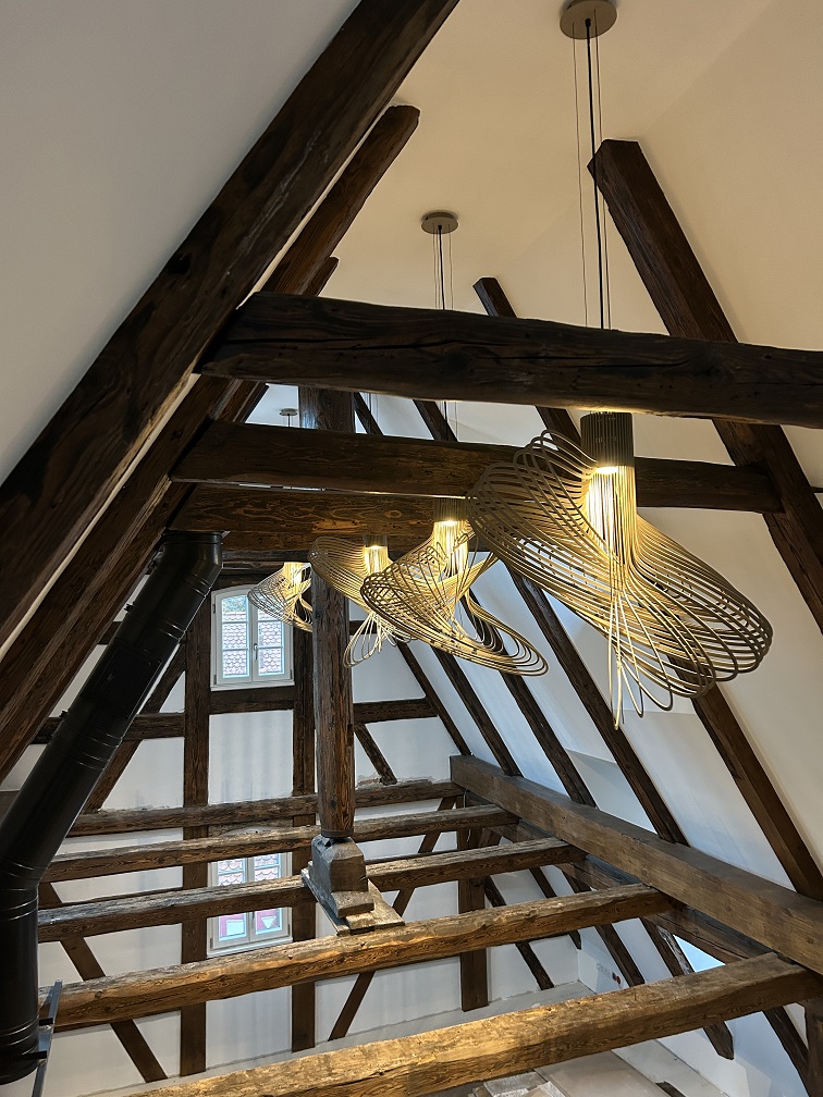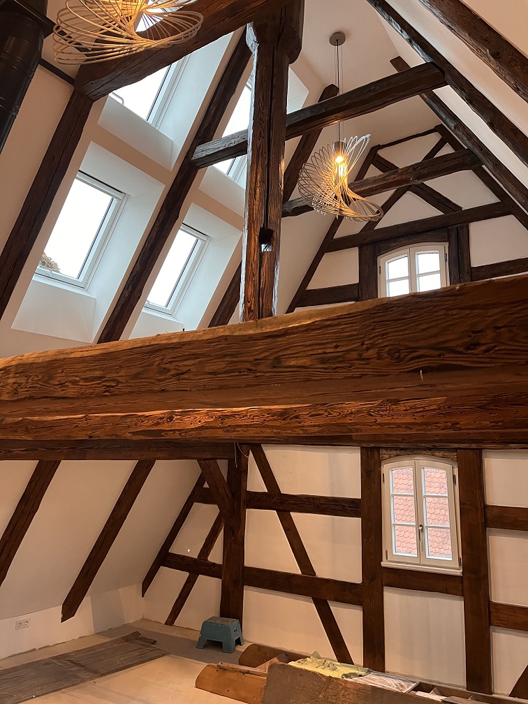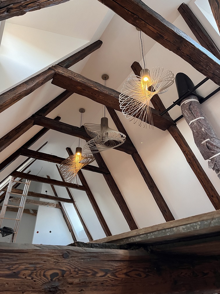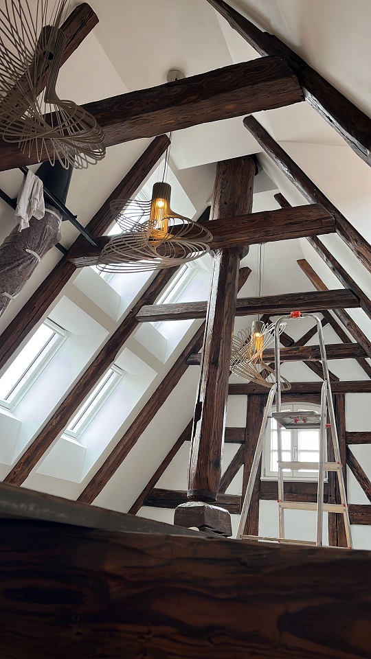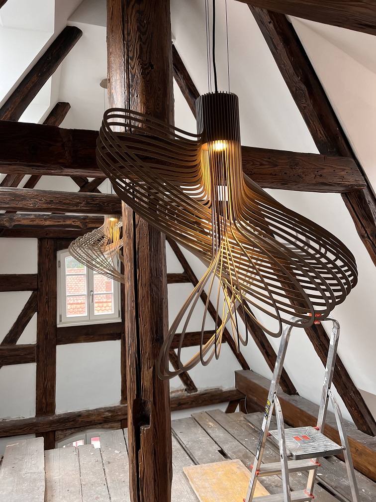 Es ist Samstag und wieder Zeit um Dinge voran zu bringen. Heute kommt Fa. L., um spontan zu helfen die neuen Lampen im Dachgeschoss Luftraum aufzuhängen. Solange noch Bretter im Zwischenboden liegen kann man das noch ganz gut machen, auch wenn das jetzt schon ziemlich weit oben ist. Zu zweit kommen wir gut voran und zum Test werden die Lampen dann auch schnell mal direkt an den Baustrom angeschlossen. Wow.