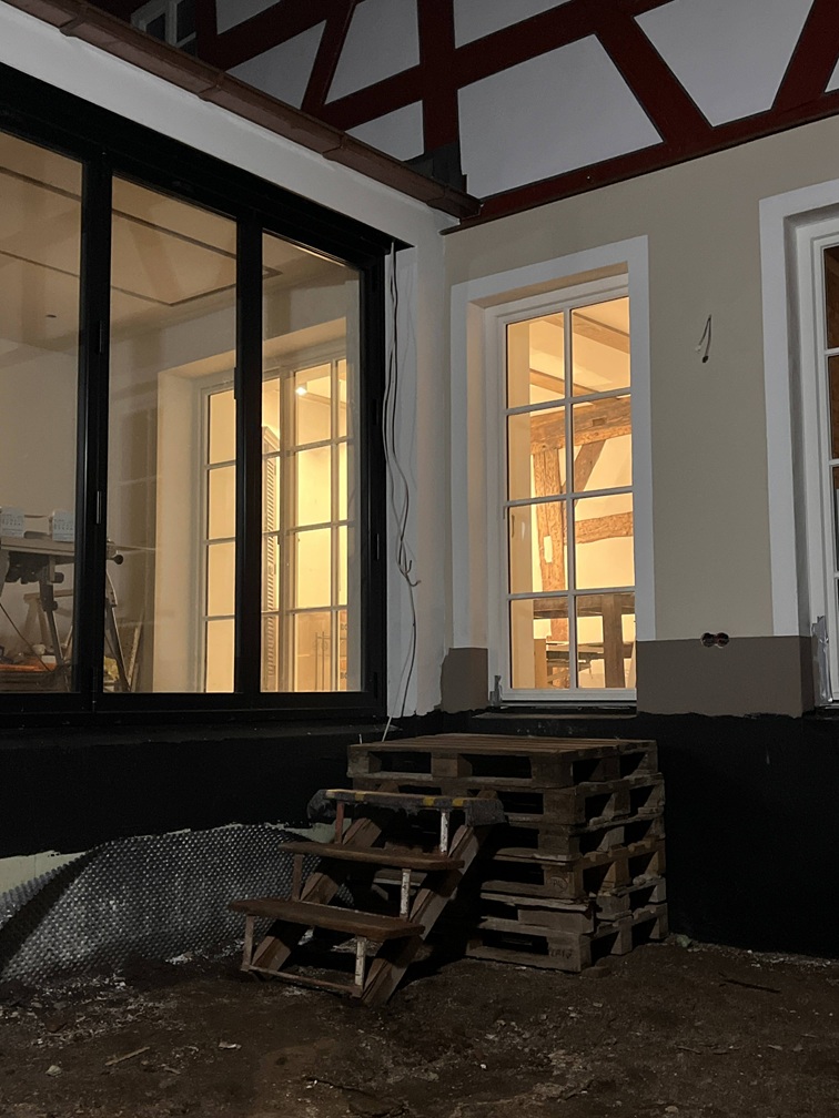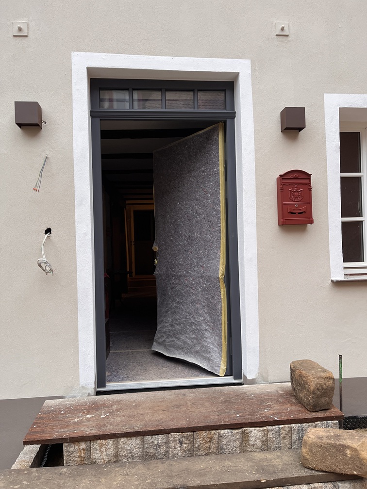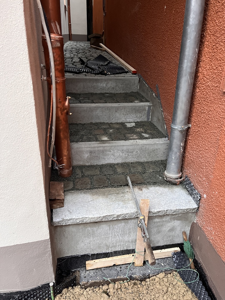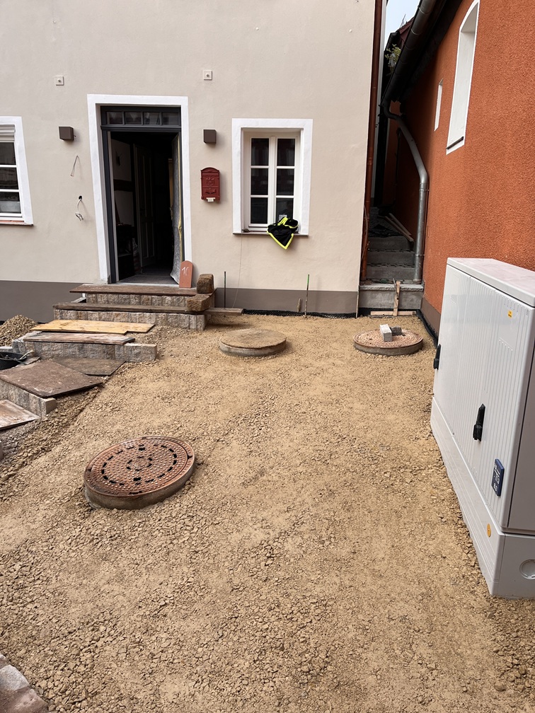 Im Außenbereich hat sich auch einiges getan und die Hausanschlüsse sind gemacht. Die ‚Ritze‘ zum Nachbarhaus ist mit dem alten Pflaster von vor dem Haus gepflastert und endlich begehbar. Und ein Briefkasten musste jetzt auch schnell her, damit uns Paket und Post erreichen können (theoretisch)