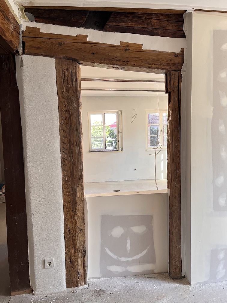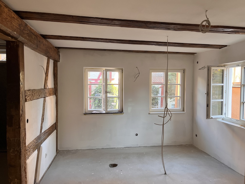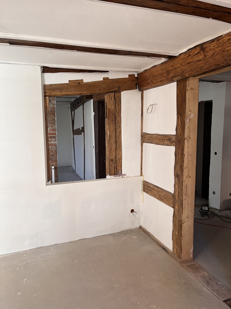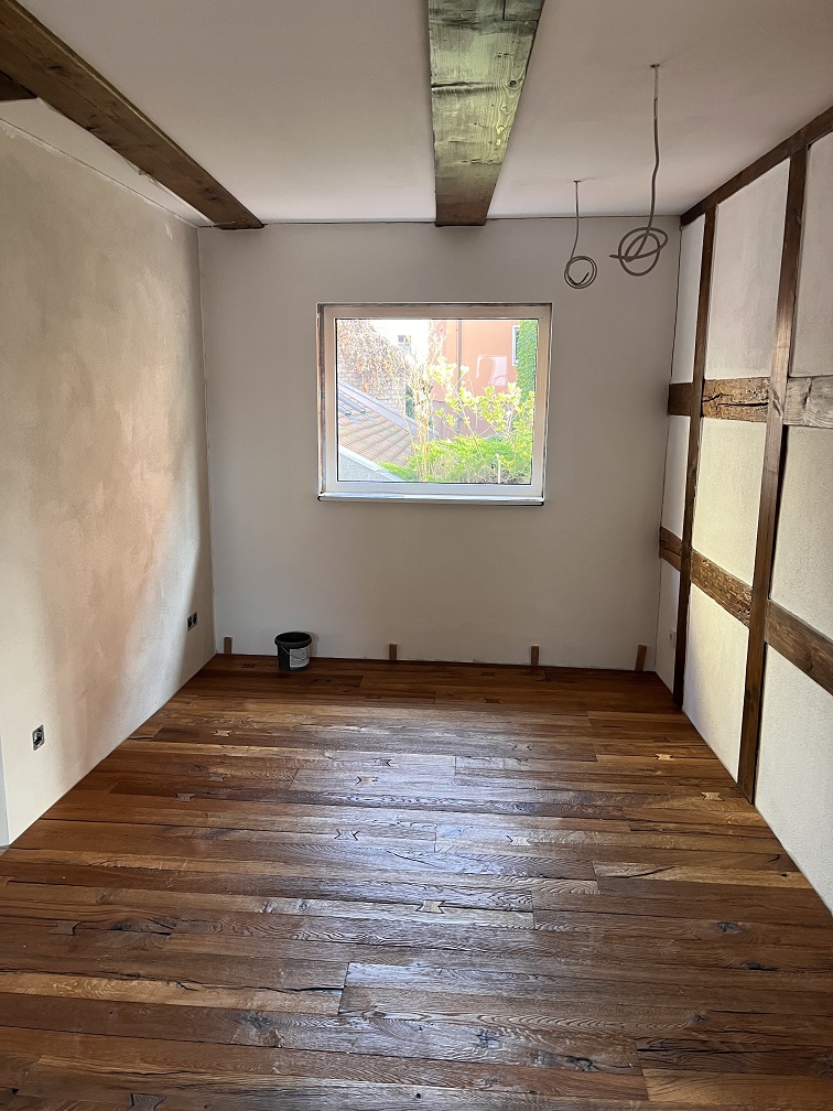 Die Handwerker waren am Freitag auch fleißig gewesen und haben ein großes Stück Parkett im OG verlegt. Sieht wunderschön aus und macht die Räume richtig wohnlich.